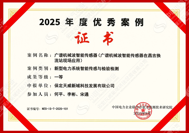 2025年9月,保定天威新域科技發(fā)展有限公司申報(bào)的“廣譜機(jī)械波智能傳感器(廣譜機(jī)械波智能傳感器在昌吉換流站現(xiàn)場(chǎng)應(yīng)用)獲評(píng)由中國(guó)電力企業(yè)聯(lián)合會(huì)電力檢測(cè)技術(shù)研究院發(fā)布的新型電力系統(tǒng)智能傳感與檢驗(yàn)檢測(cè)新技術(shù)、新產(chǎn)品、新場(chǎng)景及典型應(yīng)用案例一等獎(jiǎng)。