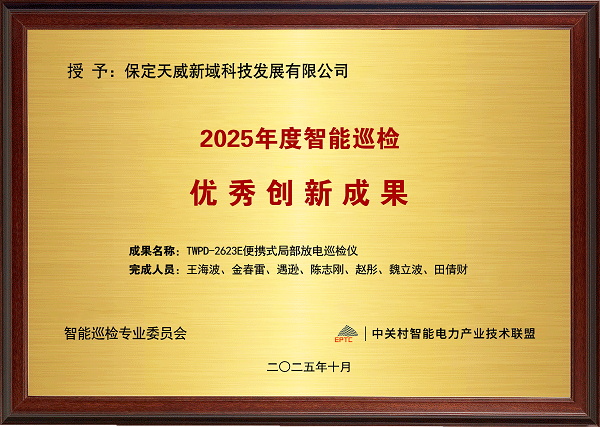 會議期間,發(fā)布2025年智能巡檢技術(shù)應用與創(chuàng)新成果名單,天威新域“TWPD-2623E便攜式局部放電巡檢儀”通過專委會資料審查、專家初審、終審答辯等環(huán)節(jié),獲評“2025年智能巡檢技術(shù)應用與創(chuàng)新成果”。